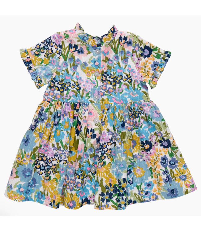 A fresh floral silhouette designed for spring celebrations and everyday wear! This short-sleeve dress features a painterly blue sketched floral print with soft ruffle detailing at the neckline and sleeves. Silver glitter buttons run down the front, adding a subtle shimmer that elevates the look while keeping it easy and wearable. Crafted with comfort in mind, this twirl-worthy style is perfect for warm-weather outings, special moments, and everything in between.