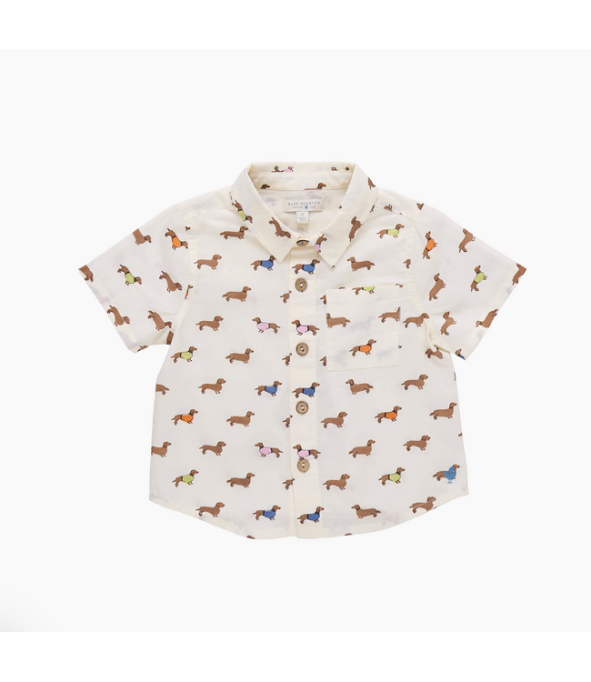 A playful classic with a pup filled twist! The Baby Boys Jack Shirt features an allover dachshunds in sweaters print in soft 100% cotton cambric. Designed with short sleeves, a front left chest pocket, and finished with wood buttons, this button up is perfect for spring gatherings and everyday dressing alike.