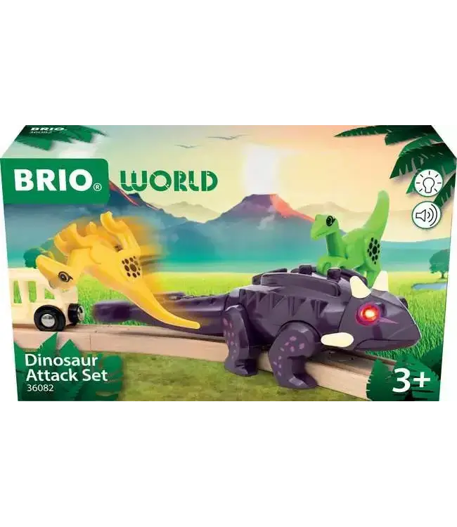 Smash through any obstacle with the 36082 Dinosaur Attack Set. Designed to fit perfectly over BRIO wooden tracks, this mighty dino comes alive with red light-up eyes and motion-activated roaring. With its spring-loaded tail ready to swing, your child can use the Ankylosaur to knock away the two colourful velociraptor figures included in this playset. A magnet hidden in its tail lets you pull wagons, just like a BRIO train. Part of the BRIO World Dinosaur range, it's a must-have for kids who love dinosaurs and trains.