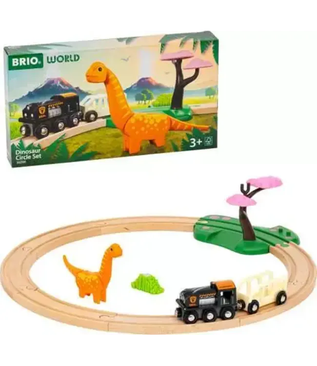 36098 Dinosaur Circle Set includes 12 pieces: 1x Brachiosaurus Figure, 1x Dinosaur-themed Engine, 1x Wagon, 1x Grass Load, 1x Meadow Crossing Track, 7x Wooden Tracks.