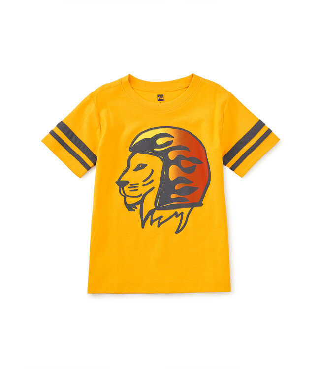 A bold lion graphic takes center stage, its strong lines and sun-warmed hues capturing a fearless, ready-for-anything spirit. Sporty sleeve stripes add an athletic edge that makes this tee feel made for action.