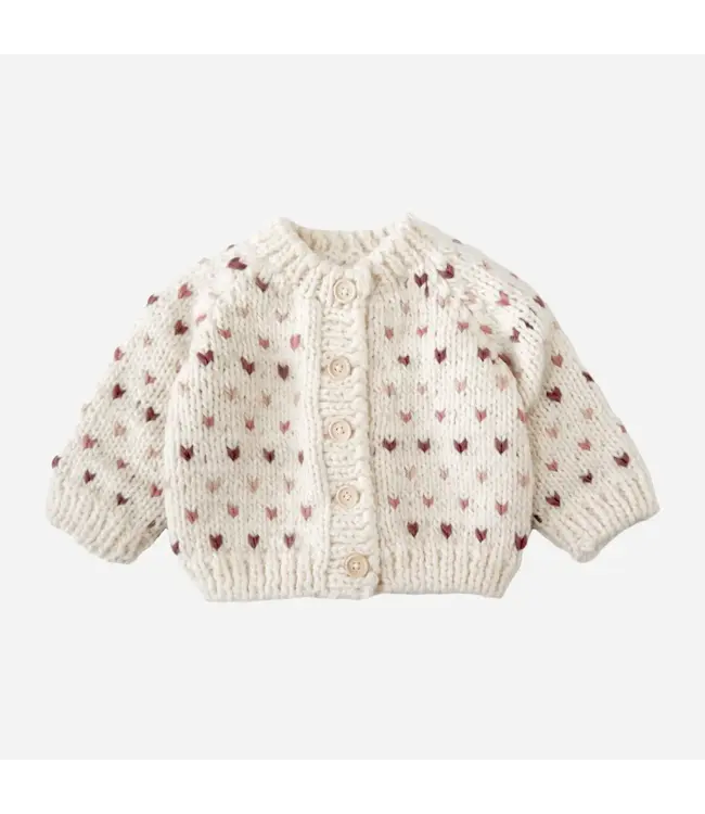 Keep it simple and sweet in our Mauve and Cream Sawyer cardigan. Features tiny heart stripes in Mauve, Rose, and Blush with a Cream pom, pair with matching hat and mittens.